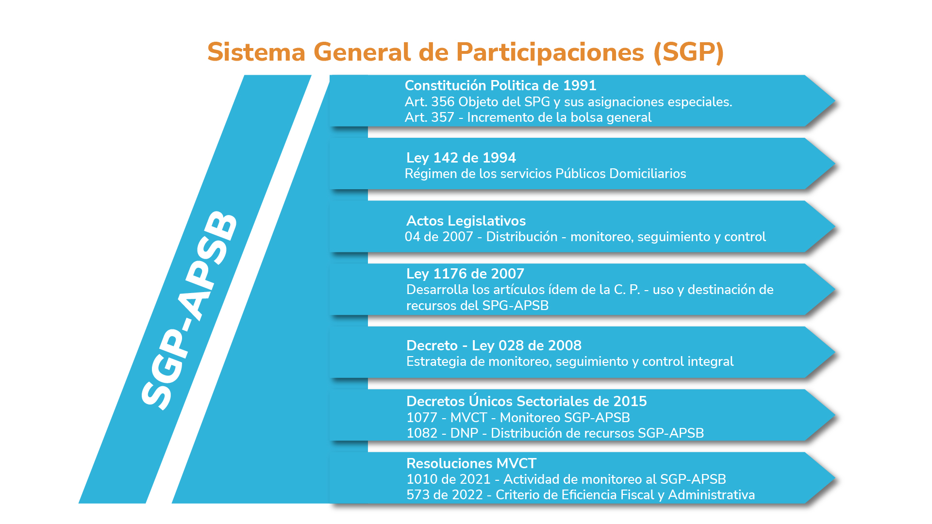 A continuación encontrara la evolución de la normatividad del Grupo de Monitoreo del Sistema General de Participaciones de Agua Potable y Saneamiento Básico. Monitoreo a los recursos del SGP-APSB Documento Adjunto Ley 1977 de 2019 Resolución 0098 de 2019 Ley 1176 de 2007 Decreto Ley 028 de 2008 Decreto 1077 de 2015 Resolución 1010 de 2021 Resolución 0573 de 2022 Modificado el Lun, 13/04/2026 - 13:39