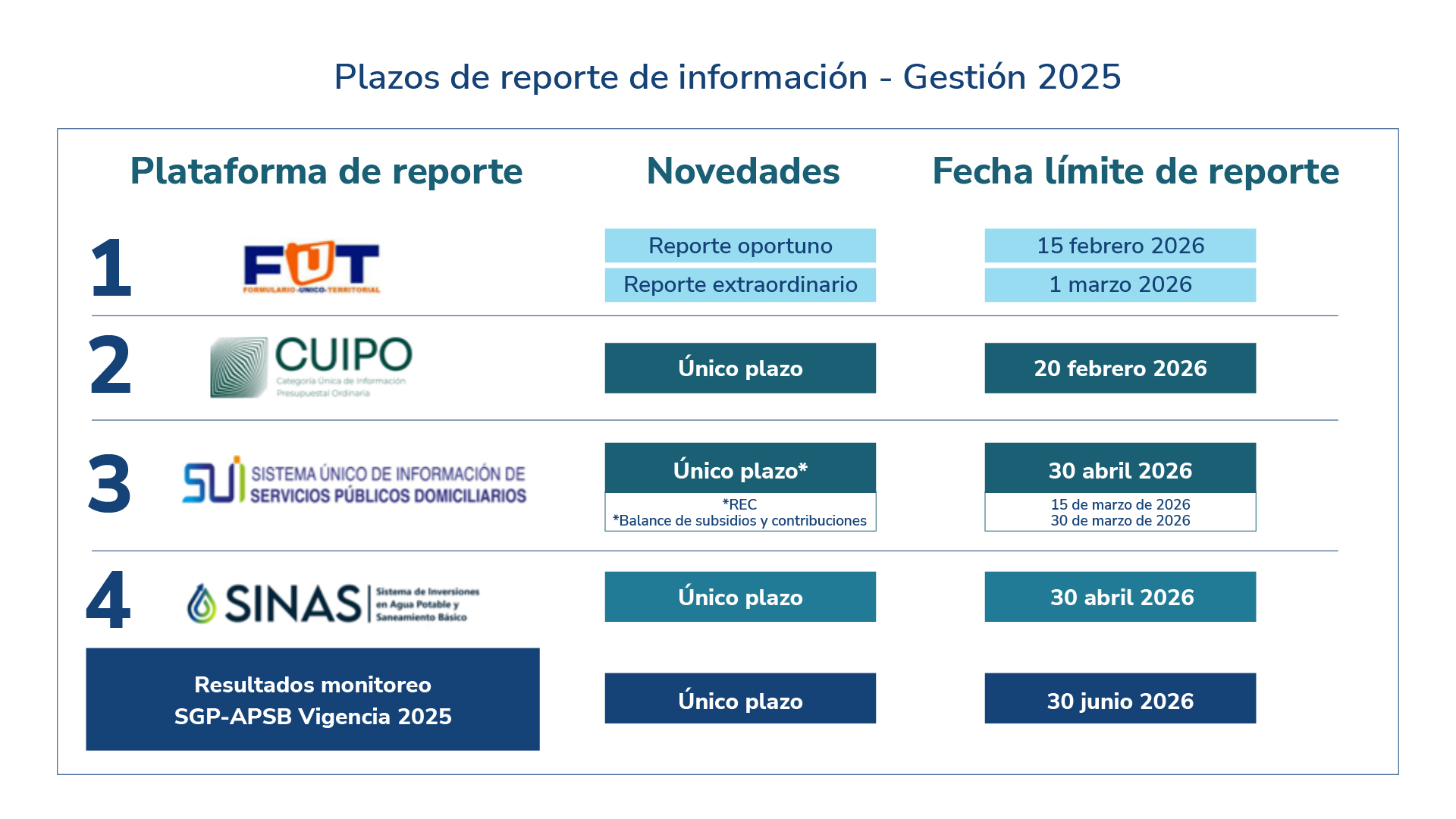 En el marco de la estrategia de monitoreo, seguimiento y control integral establecida en el Decreto 028 de 2008, sobre el uso y destinación de los recursos del SGP-APSB, el MVCT, a través del Viceministerio de Agua y Saneamiento, lleva a cabo la actividad de monitoreo mediante la aplicación de los indicadores específicos y estratégicos con base en la información reportada por las entidades territoriales a través del Formulario Único Territorial -FUT, la Categoría Única de Información del Presupuesto Ordinario -CUIPO, el Sistema Único de Información -SUI y el Sistema de Inversiones en Agua Potable y Saneamiento Básico -SINAS; así como la información suministrada por el Departamento Administrativo Nacional de Estadística -DANE de la actualización o adopción de la estratificación, conforme con la metodología nacional vigente, la reportada por las autoridades sanitarias competentes al Sistema de información para la Vigilancia en el Laboratorio Nacional de Referencia, y en fuentes de información certificadas por entidades nacionales o territoriales, respecto al Censo Nacional de Población y Vivienda 2018.