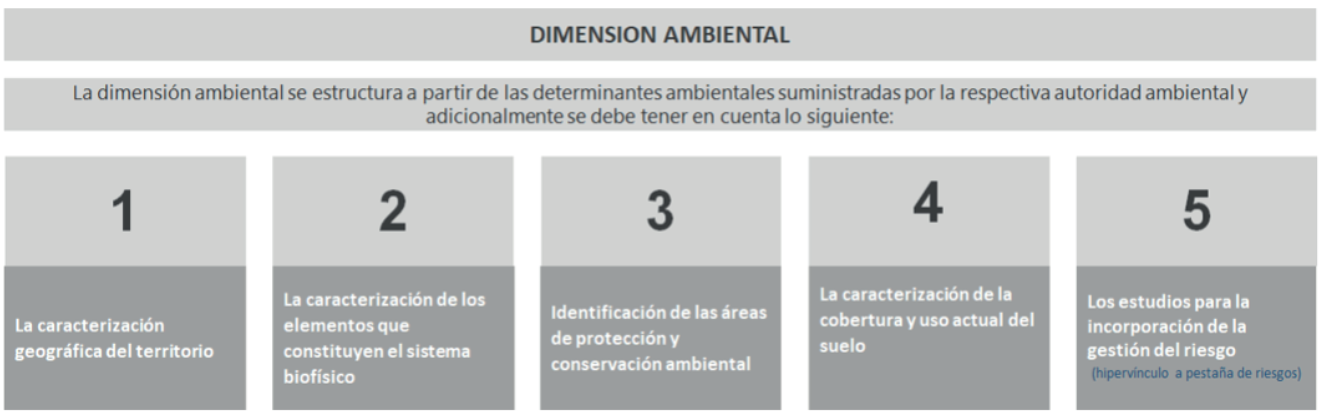 El análisis de esta dimensión se estructura a partir de la información relacionada con las determinantes ambientales establecidas en el artículo 10 de la Ley 388 de 1997. Durante esta etapa, el municipio o distrito deberá solicitar a la respectiva corporación ambiental o autoridad ambiental competente, las determinantes ambientales, las cuales deben estar soportadas en estudios técnicos y acompañadas de cartografía cuando a ello haya lugar, así como los demás estudios técnicos disponibles para la planeación territorial, lo cual deberá ser atendido por dicha autoridad ambiental en un plazo máximo de 15 días hábiles.