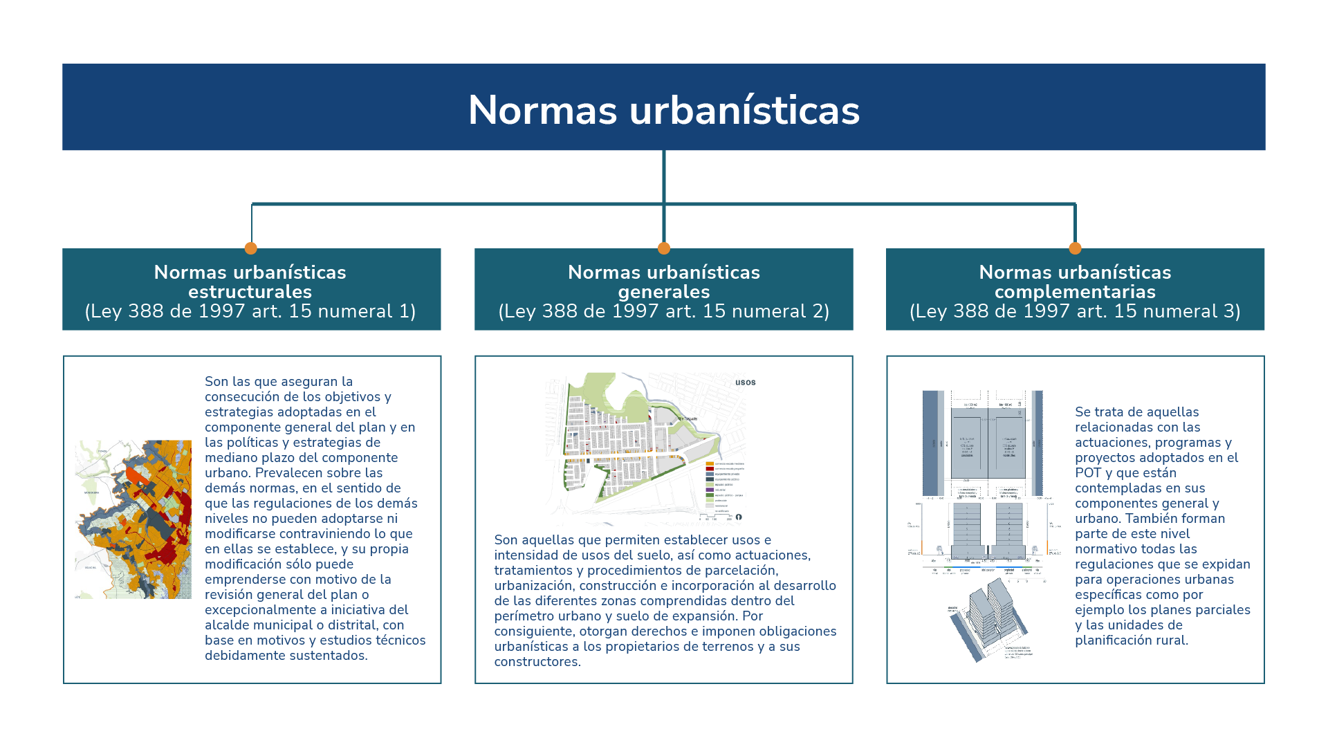Las normas urbanísticas hacen parte del POT: regulan el uso, la ocupación y el aprovechamiento del suelo y definen la naturaleza y las consecuencias de las actuaciones urbanísticas indispensables para la implementación del POT. De acuerdo con su naturaleza (normas estructurales, generales y complementarias) tienen una relación con las vigencias de los contenidos del POT y, a partir de esta característica, es posible entender a que apuntan y cuando pueden revisarse o ajustarse: