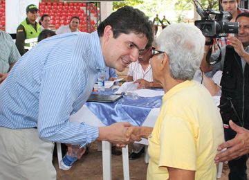 El Ministro de Vivienda, Luis Felipe Henao, felicita a la señora Cecilia García, una de las beneficiarias con el sorteo público de las casas gratis en Girardot. Foto Edna Julieta Sandoval (MVCT)