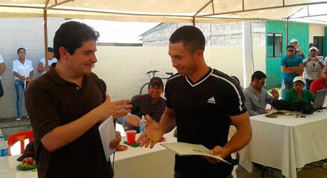 El Ministro de Vivienda, Felipe Henao, entrega las escrituras de su casa nueva a Aníbal Vargas, uno de los felices beneficiarios en Repelón. Foto: René Valenzuela. MVCT.