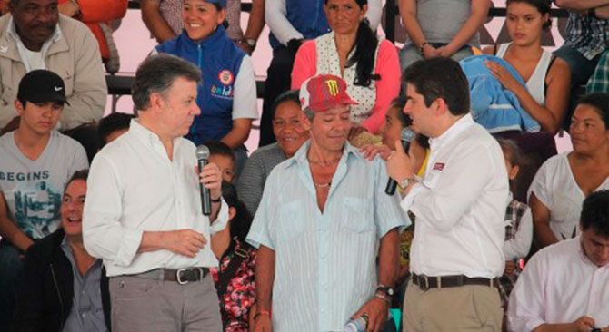 El presidente de la República, Juan Manuel Santos y el ministro de Vivienda, Luis Felipe Henao Cardona, entregan su vivienda gratis en la Urbanización San Sebastián de Manizales a Luis María Florez, campesino y desplazado de Bolívar, Caldas. Fotografía: René Valenzuela (Prensa MVCT)