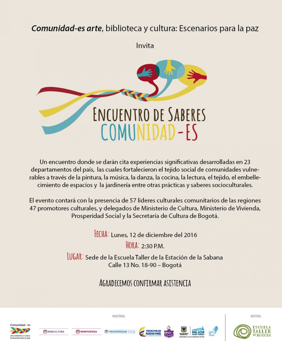 Bogotá D.C., viernes 9 de diciembre de 2016. (MVCT).- Con un intercambio de experiencias Comunidad-es arte, biblioteca y cultura: escenarios para la paz, concluye su tercer año y para ello reunirá algunas de las prácticas culturales que se destacaron durante el 2016.