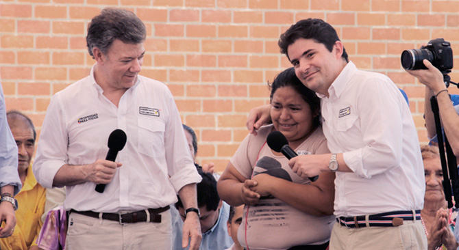 Presidente SAntos y Ministro de Vivienda durante jornada de entrega de viviendas en 2015. Foto: René Valenzuela. MVCT.