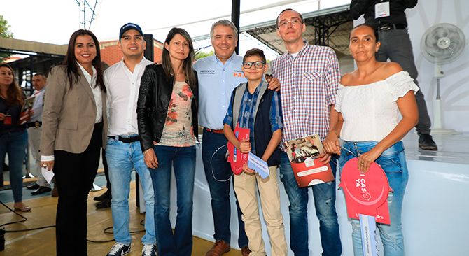 Presidente de la República, Iván Duque, Ministro de Vivienda, Jonathan Malagón y familias beneficiarias. Foto: René Valenzuela (MVCT).