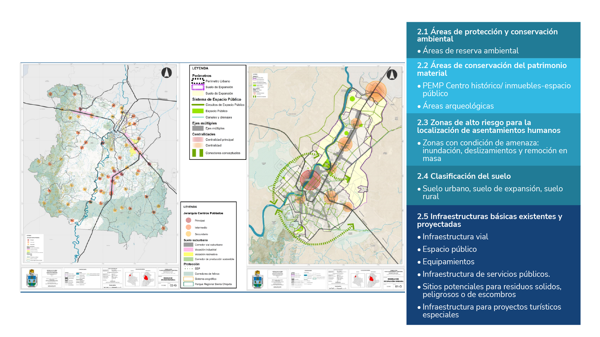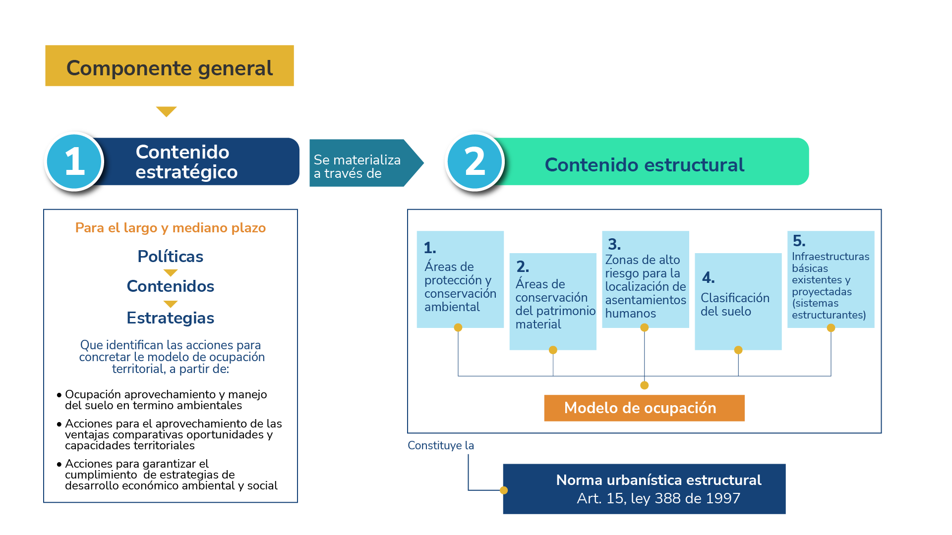 El componente general define el contenido estratégico y estructural del POT, es decir, nos ayuda a trazar una ruta para las acciones de ordenamiento a mediano y largo plazo; ESTRATEGICO - de donde arrancamos y a donde queremos llegar durante la vigencia del plan, y ESTRUCTURAL - que define el “que” y el “como” ocupar, aprovechar de manera sostenible y organizar funcionalmente el territorio municipal. A través de los dos contenidos mencionados se construye el modelo de ocupación que para su definición siempre se trendán en cuenta las determinantes del art 10 de la ley 388 de 1997.