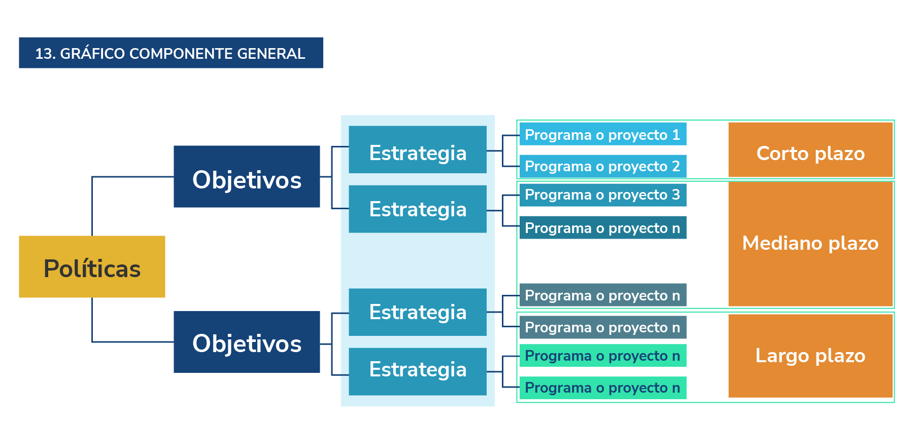 Las anteriores, se establecen de acuerdo a las necesidades que el municipio ha identificado mediante el diagnóstico territorial y el seguimiento y evaluación. De acuerdo con los temas principales que el municipio quiere priorizar para ordenar su territorio, es recomendable plantear un número conciso de políticas, objetivos y estrategias, redactadas de manera sencilla, articuladas entre si y que fijan alcances y retos que el municipio pueda asumir según su capacidad administrativa y financiera. A Continuación, se propone una gráfica que explica cual es la relación lógica entre los contenidos estratégicos (acciones) y las decisiones de ordenamiento territorial que materializan en el corto, mediano y largo plazo (programas y proyectos), lo que el POT establece desde el componente general.