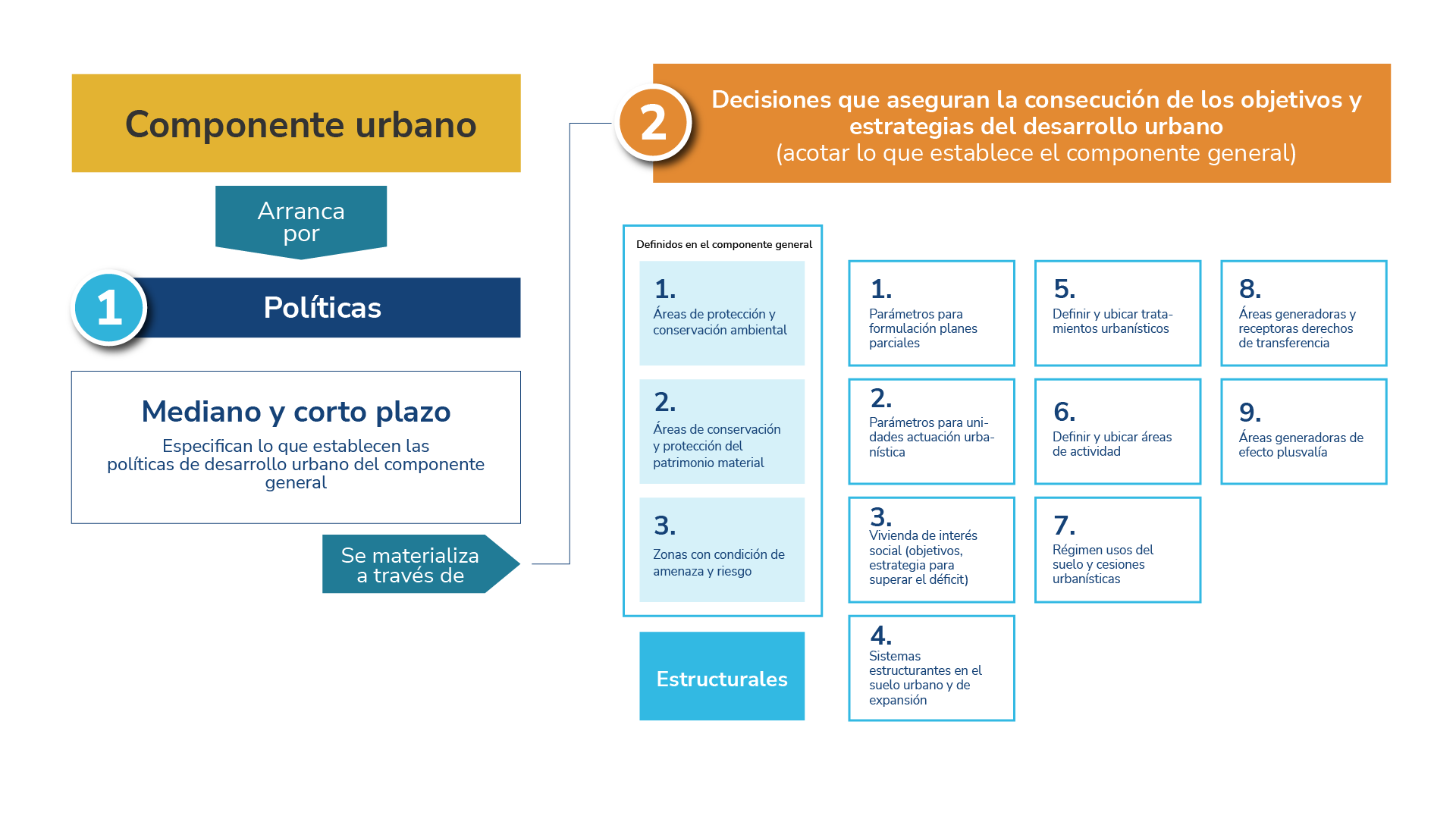 Según el artículo 13 de la Ley 388 de 1997, el componente urbano del plan de ordenamiento territorial es un instrumento para la administración del desarrollo y la ocupación del espacio físico clasificado como suelo urbano y suelo de expansión urbana, que integra políticas de mediano y corto plazo, procedimientos e instrumentos de gestión y normas urbanísticas.