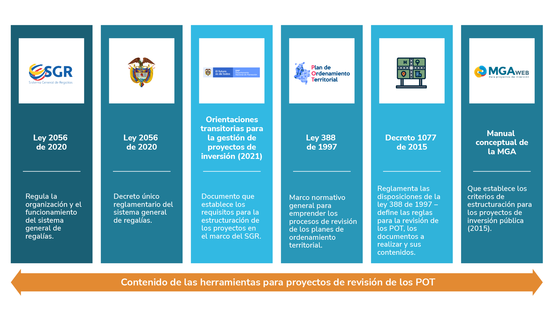 El Ministerio de Vivienda, Ciudad y Territorio, ha realizado un ejercicio técnico coordinado entre sus dependencias - Oficina Asesora de Planeación y la Dirección de Espacio Urbano y Territorial – con el fin de ofrecer a las entidades territoriales una herramienta metodológica que le permita adelantar, con mayor agilidad, el proceso de formulación de los proyectos para realizar la revisión o modificación de los Planes de Ordenamiento Territorial en el marco del Sistema General de Regalías (SGR). Las herramientas constituyen una recomendación de carácter técnico y no sustituyen las normas vigentes; sin embargo, estas se apoyan en el marco normativo siguiente y son objeto de constante actualización: