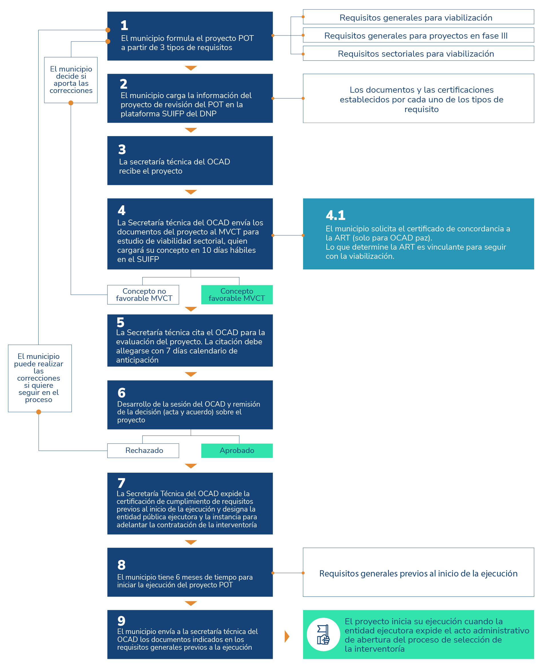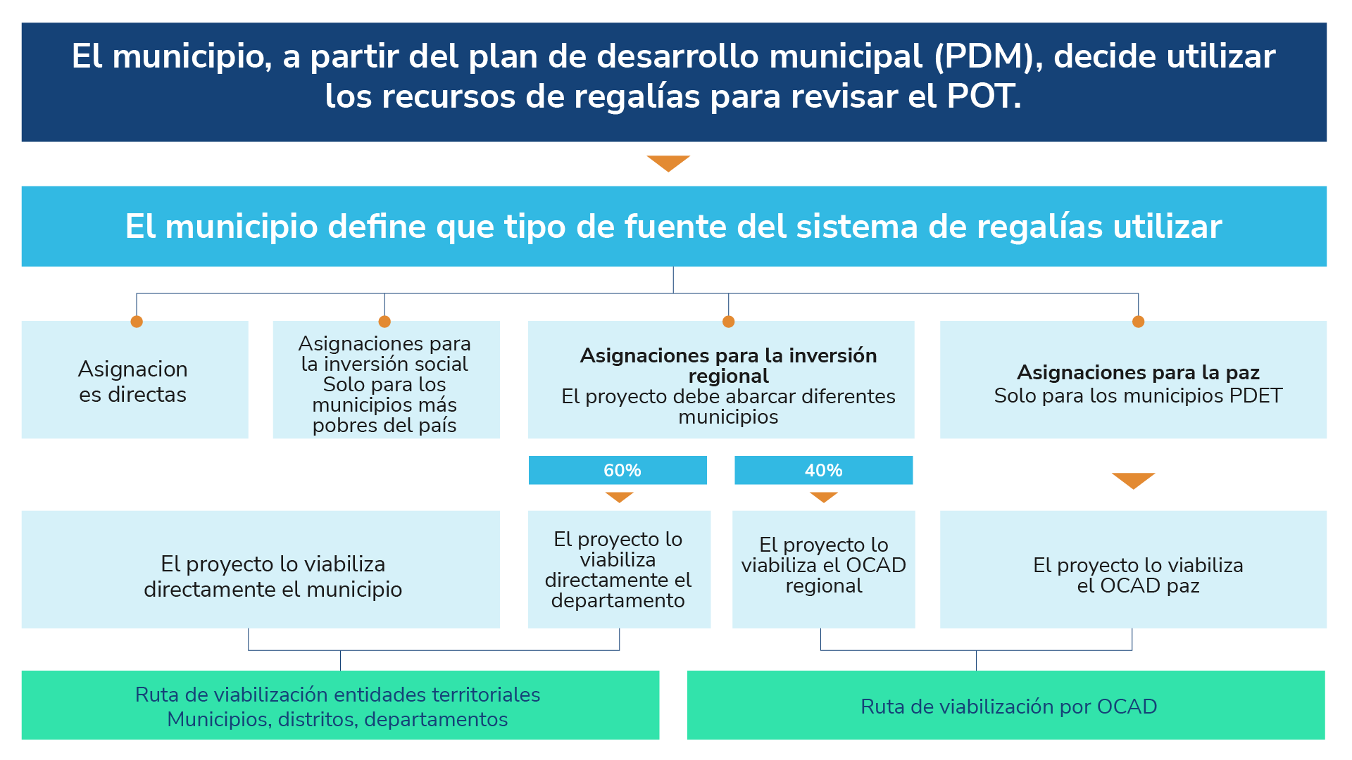A continuación, se presenta la ruta que los municipios, distritos y departamentos tendrán en cuenta para la estructuración y viablización de los proyectos de revisión de los POT; el siguiente esquema aplica cuando se usen las asignaciones las asignaciones del 40% para la inversión regional y las asignaciones para la PAZ respectivamente y según las condiciones que se aclararon en la sección de viabilización del proyecto POT: