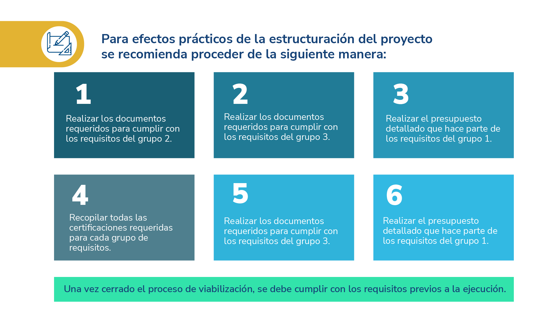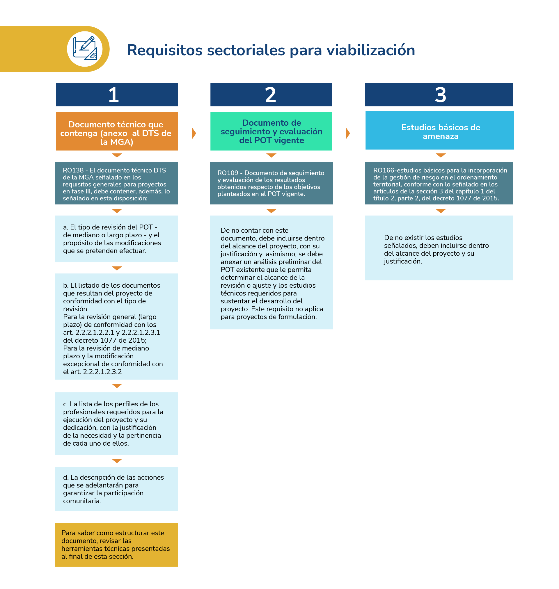De acuerdo con las rutas de viabilización presentadas, en esta sección se muestra cuales son los tres grupos de requisitos que se deben cumplir para estructurar el proyecto de revisión de los POT en el marco del Sistema General de Regalías.