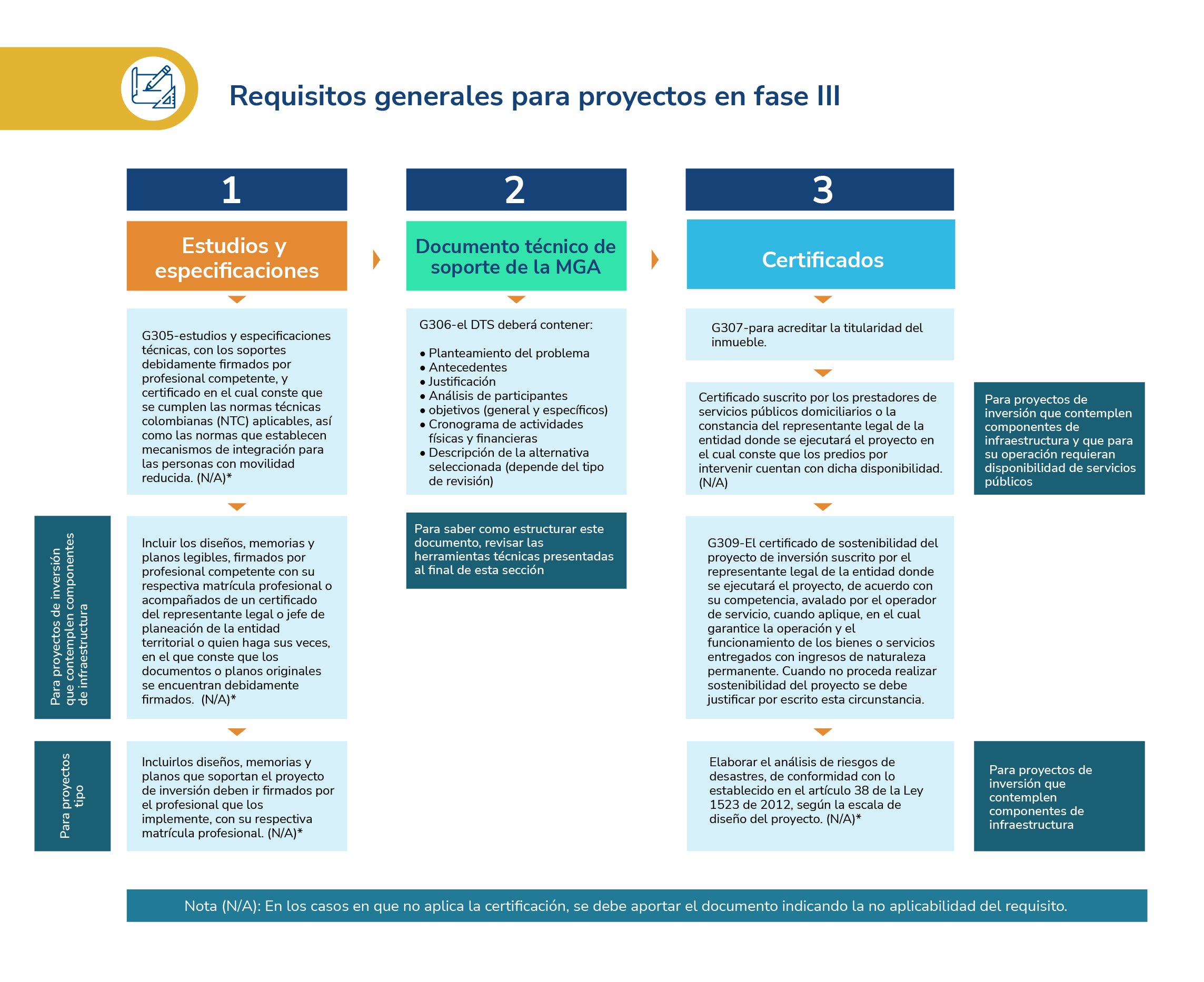 Estos requisitos hacen parte de aquellos aplicables a los proyecto de inversión que se financie con el sistema general de regalías y se aprestan a la fase III, es decir a la fase de implementación.
