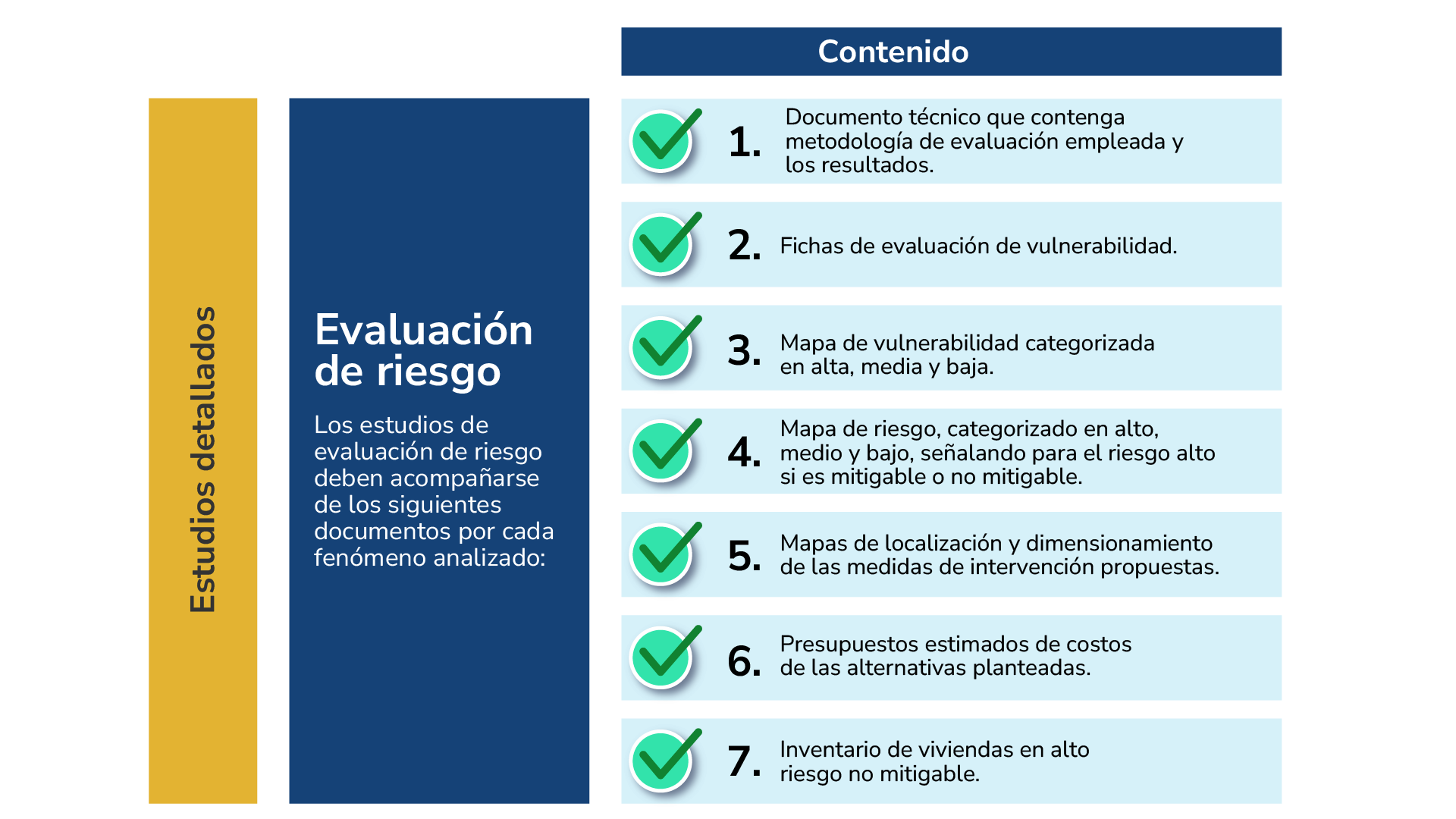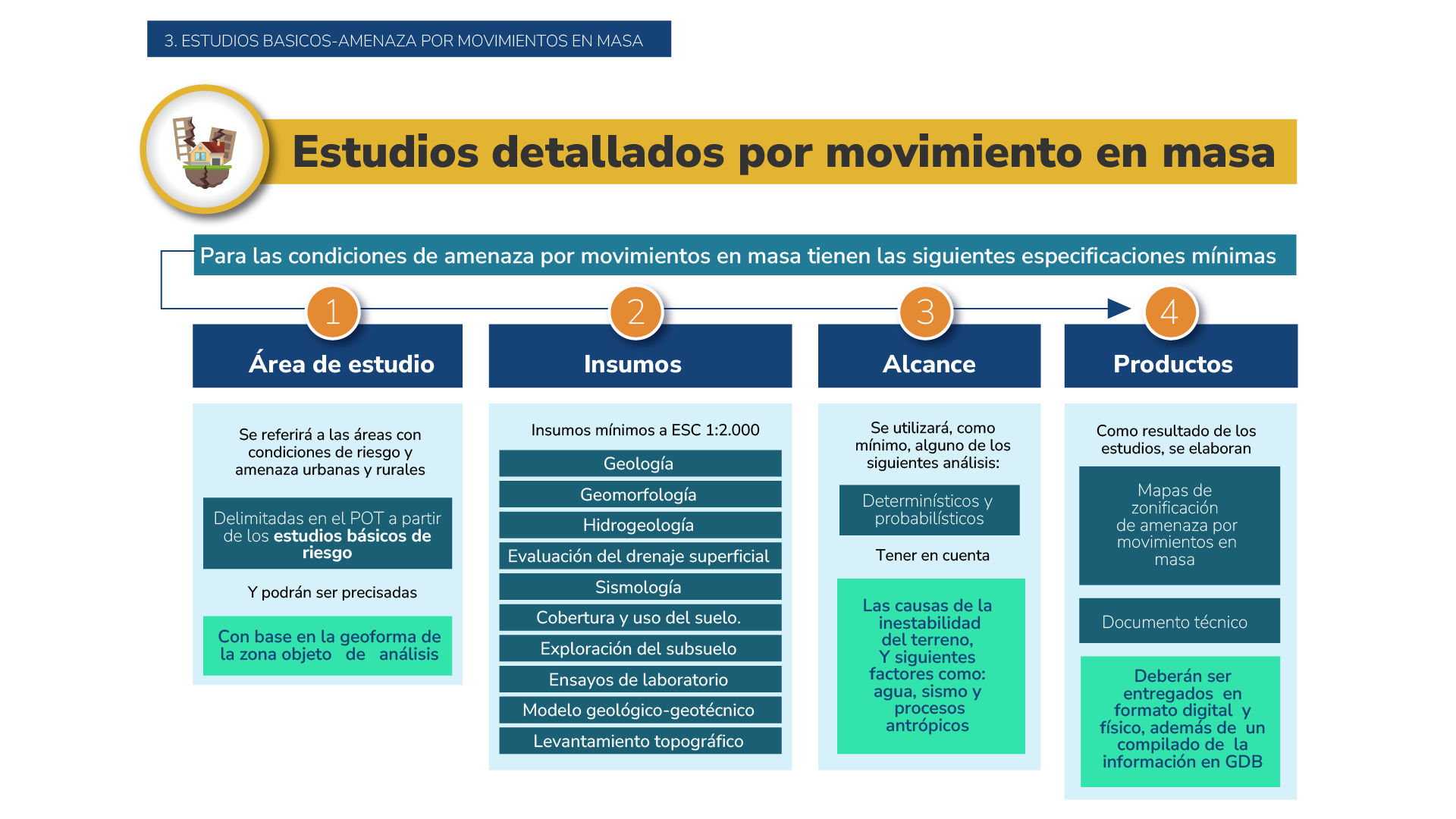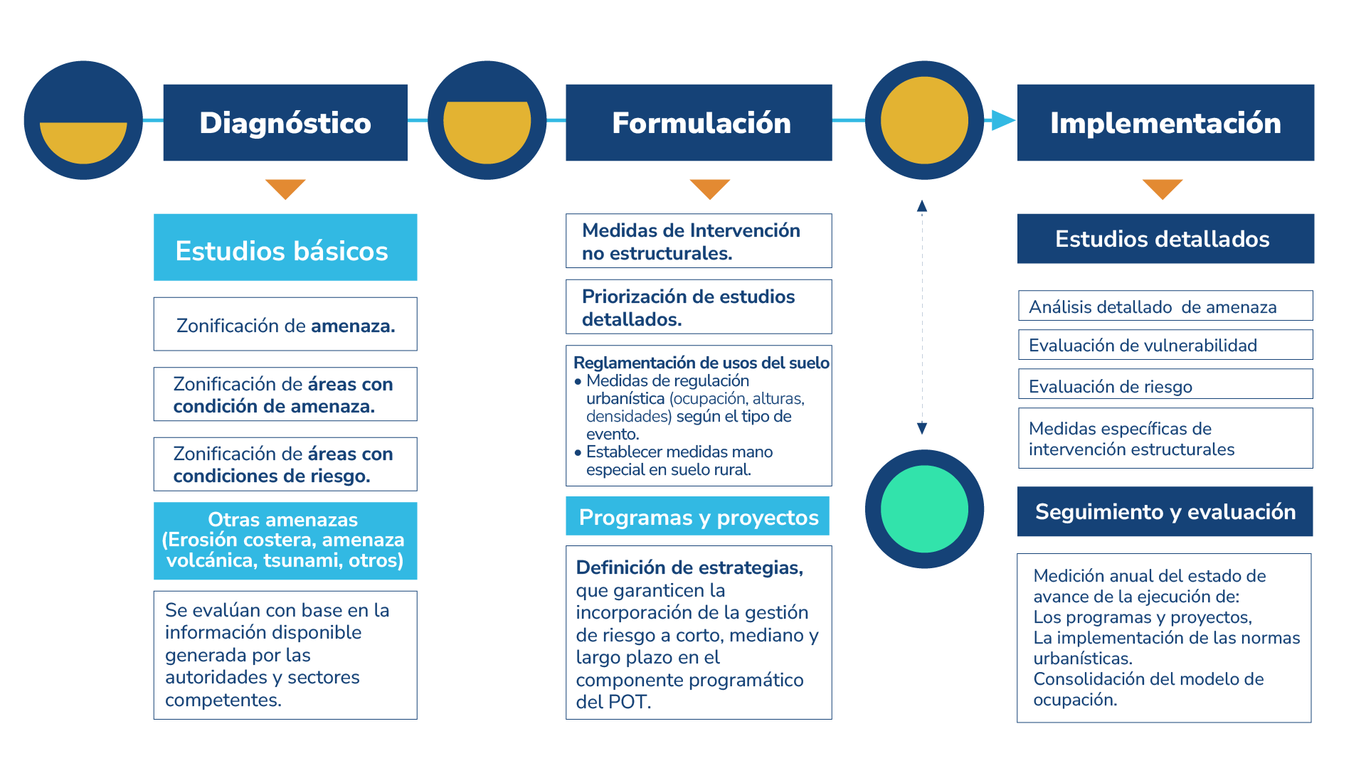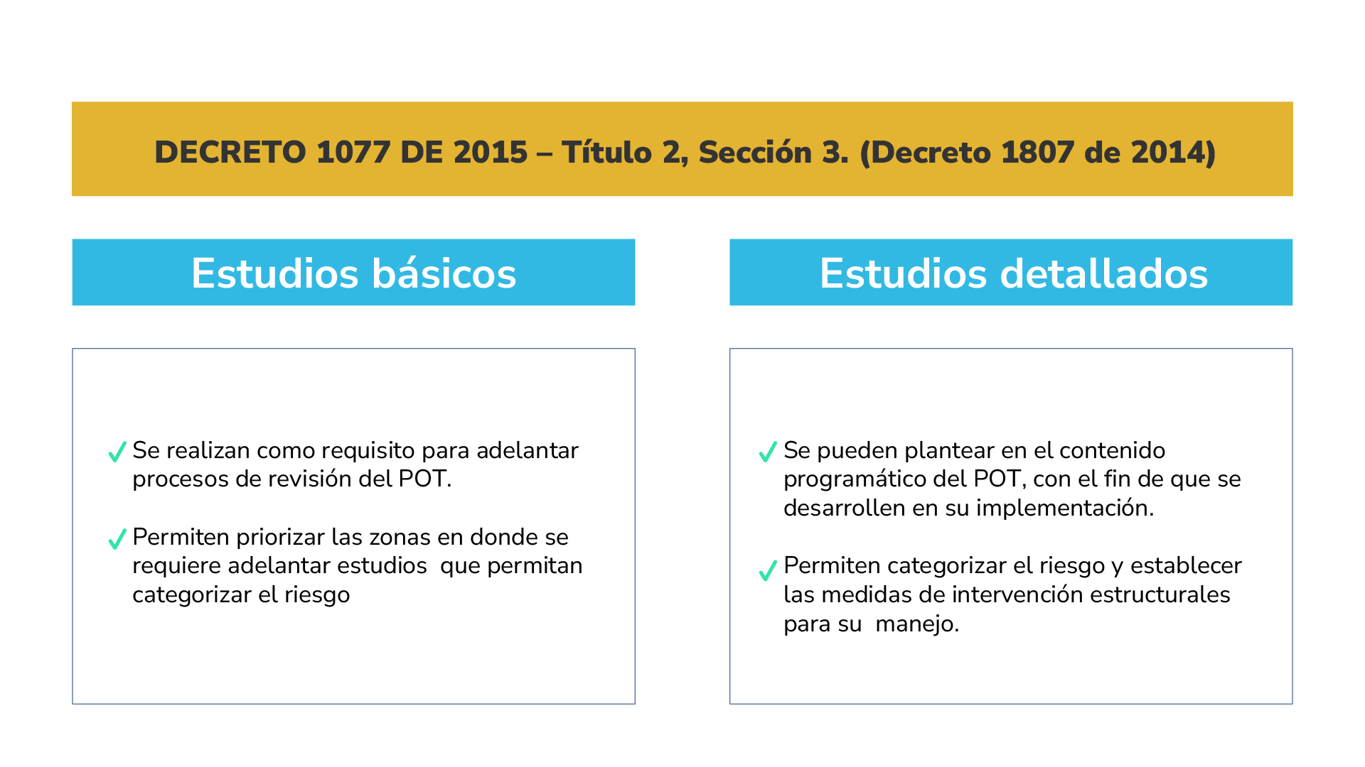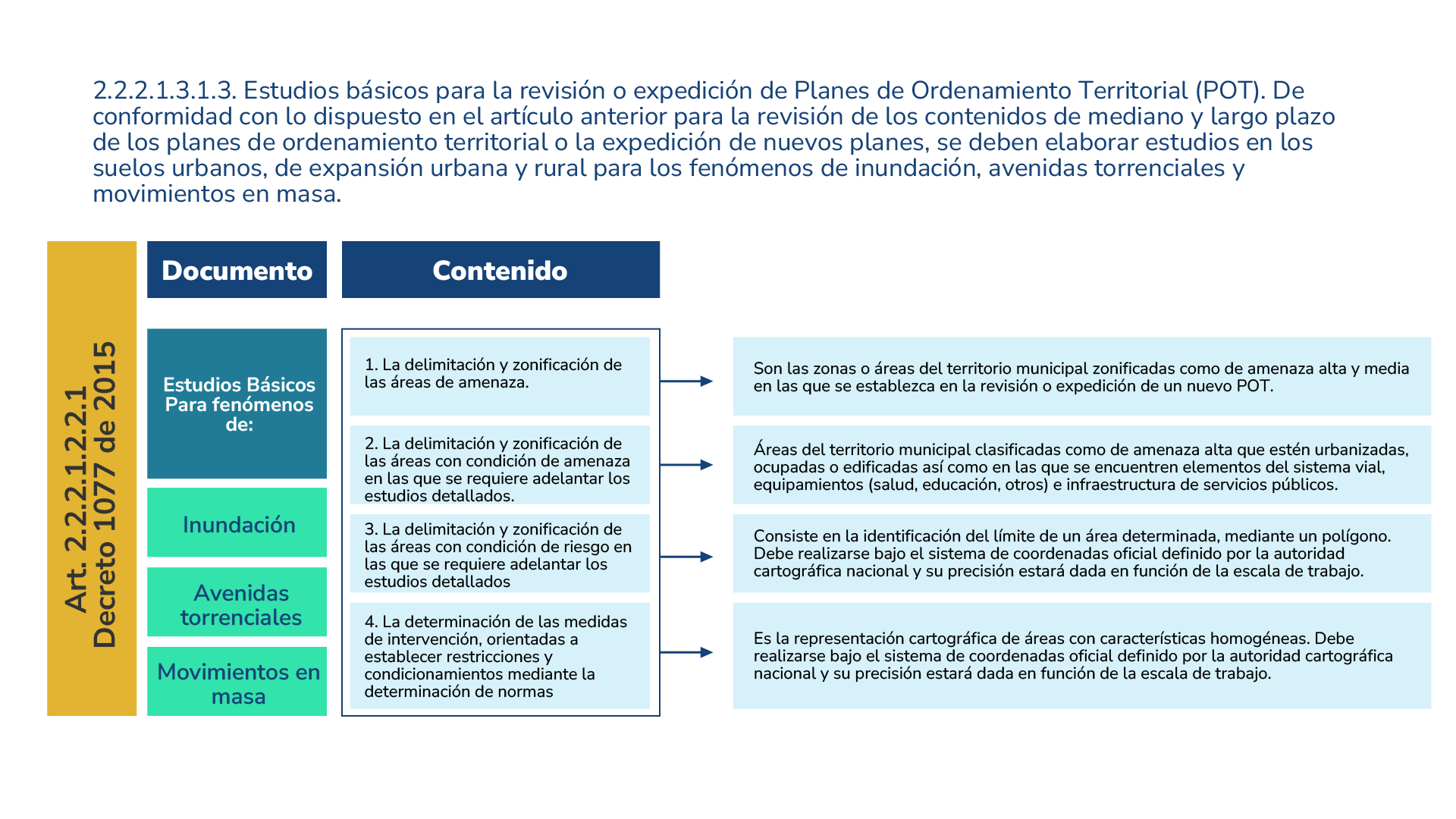 Para adelantar la revisión de los POT por vencimiento de las vigencias de mediano y largo plazo o la expedición de uno nuevo, se requiere contar con los resultados de los Estudios Básicos y con base en esta información definir las áreas con condición de amenaza y/o con condición de riesgo en donde se adelantarán Estudios Detallados, estableciendo las condiciones para el desarrollo de estos últimos, los cuales se ejecutarán en la fase de implementación del POT.