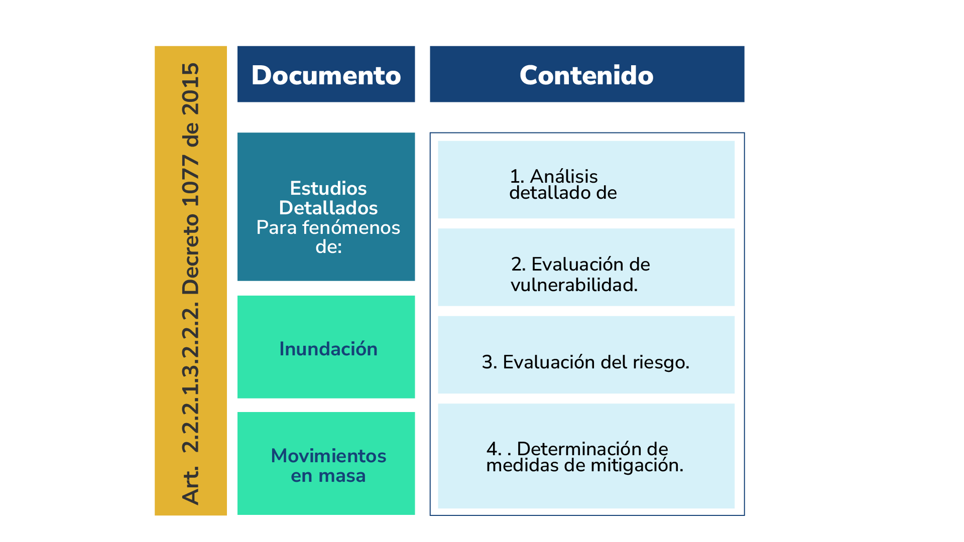 Así como se desarrollan los Estudios Básicos en la Etapa de Diagnóstico, los Estudios Detallado se desarrollarán en la etapa de Implementación. Los Estudios Detallados tienen como producto final, según el Decreto 1077 de 2015 en su ARTÍCULO 2.2.2.1.3.2.2.1:
