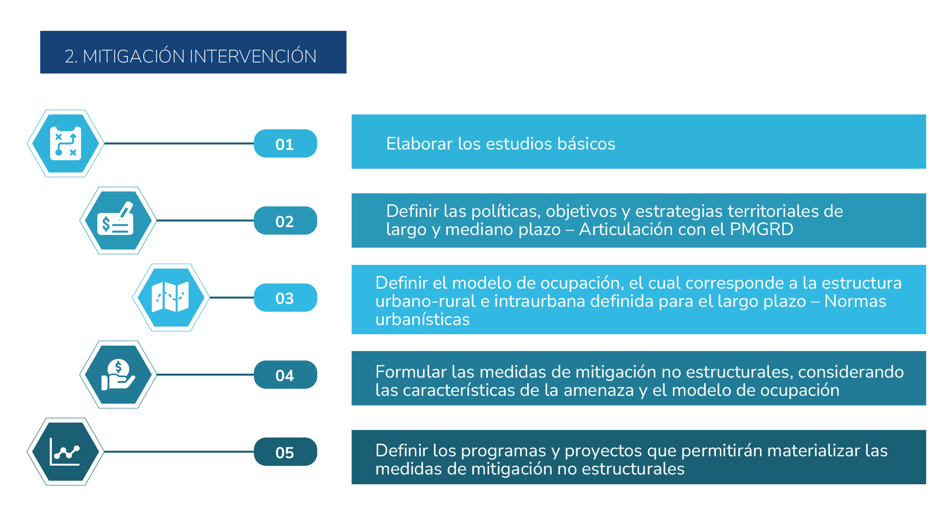 Con base en los resultados de los estudios básicos, se deben determinar las medidas de mitigación no estructuralesorientadas a establecer el modelo de ocupacióndel territorio y las restricciones o condicionamientos para el uso del suelo cuando sea viable, mediante la determinación de normas urbanísticas.