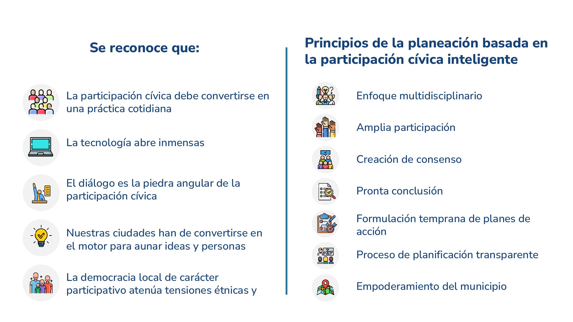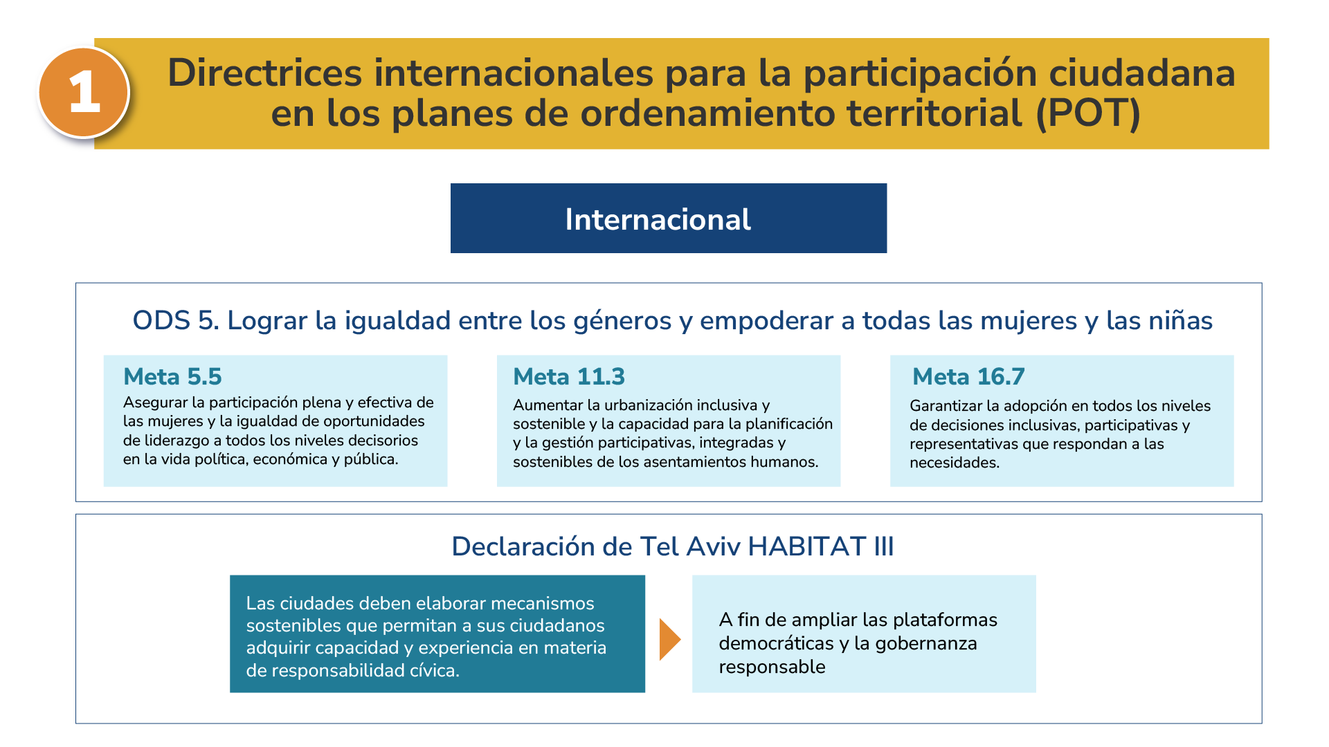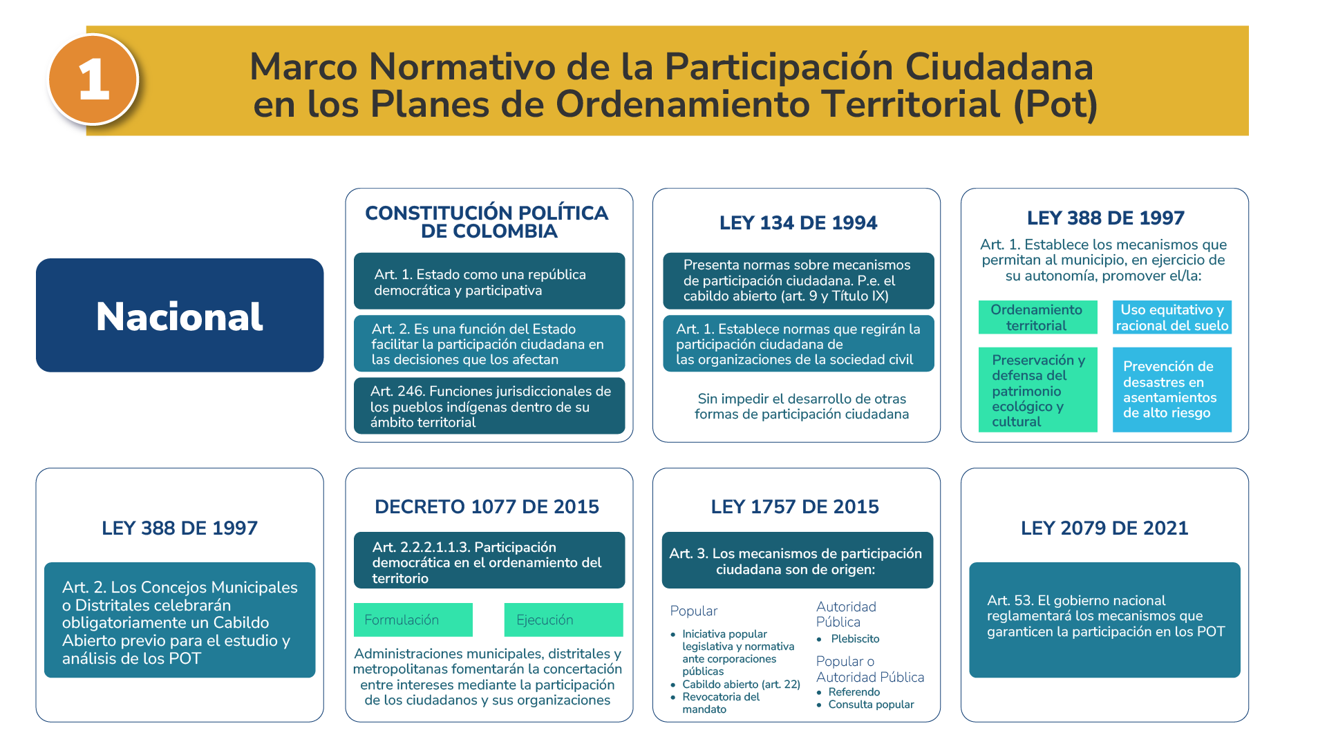 1. Entender la participación democrática en los POT como un eje transversal para lograr altos niveles de inclusión, legitimidad, diálogo y construcción de consensos y visiones más amplias de los territorios.