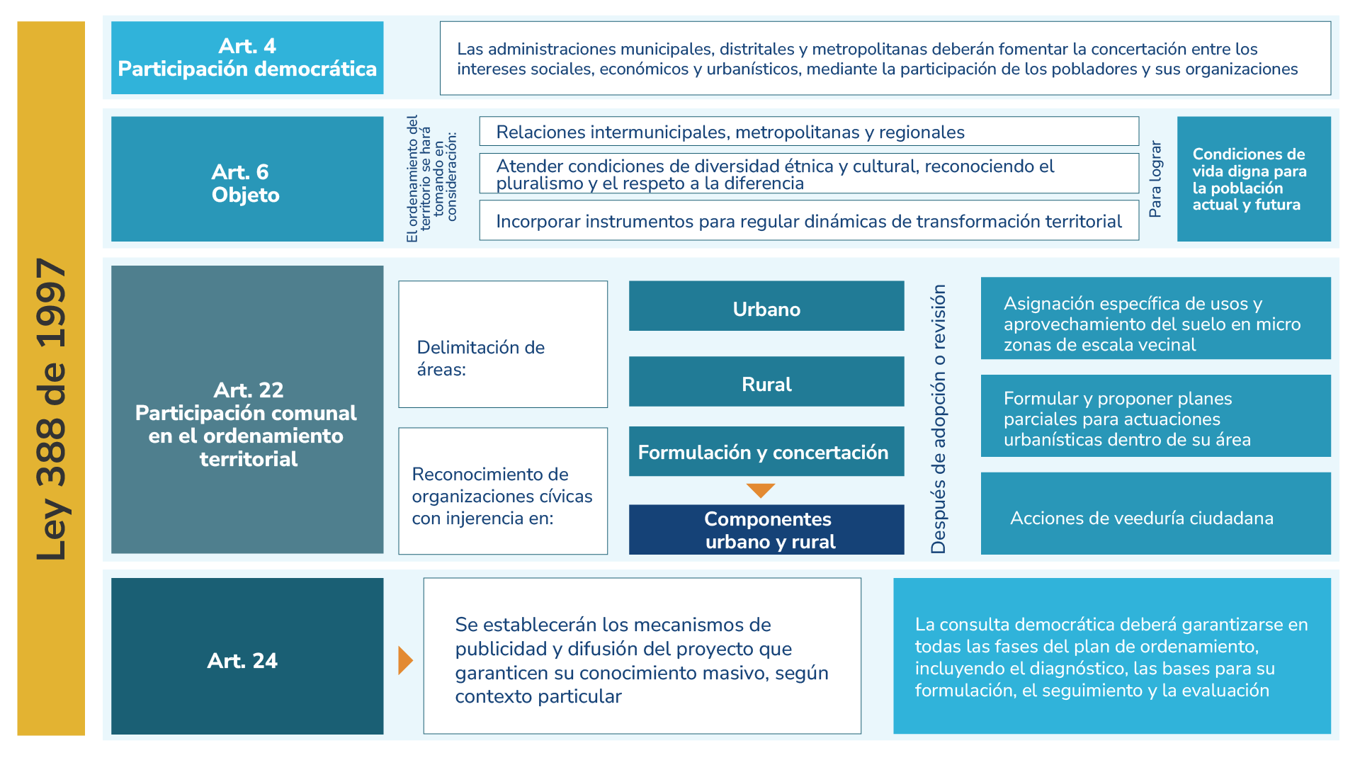 En los procesos de revisión de los POT, las administraciones municipales y distritales deben fomentar la articulación entre los intereses sociales, económicos , urbanísticos, entre otros, mediante el desarrollo de los mecanismos que faciliten la participación de las comunidades y sus organizaciones.